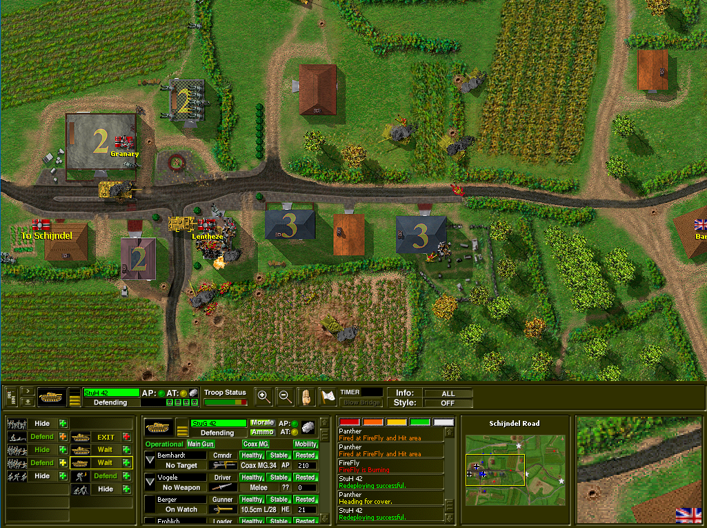 Did I say where is the enemy armour? In the space of a few minutes a Sherman clattered down my left flank and was taken out by the StuH 42 from the side. A Stuart made the mistake of presenting itself to the Panther on my right flank and was destroyed along with a Sherman 76 which could have caused me a problem. The a Firefly appeared, and that definitely could cause me a problem as it can go toe to toe with a Panther with ease.